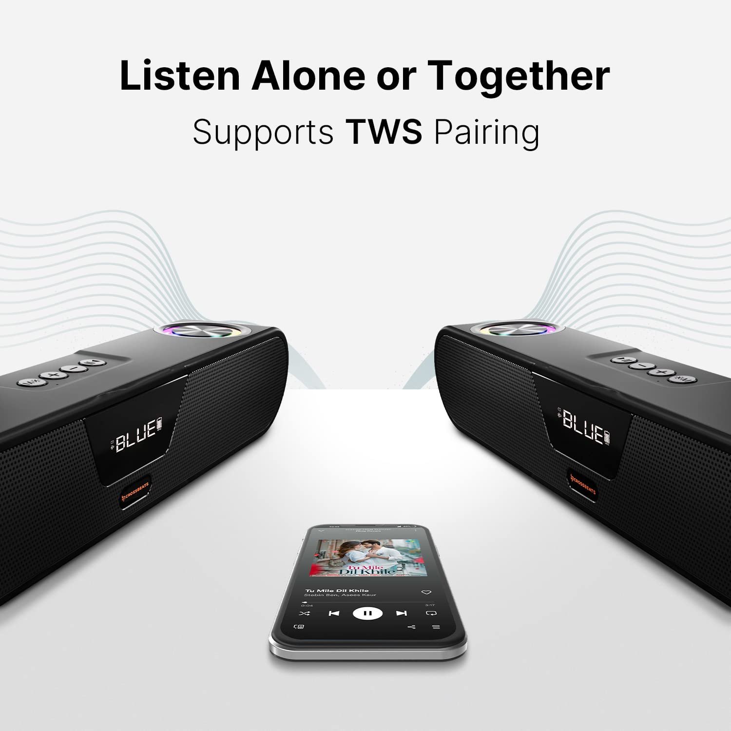 - Strong HD Sound: The two premium speakers, passive radiators, and gigantic batteries produce crisp surround sound that immerses you in the music. Additionally, this soundbar comes with Karaoke, party lights, and a mobile slot that transforms it into your very own audiovisual hub.