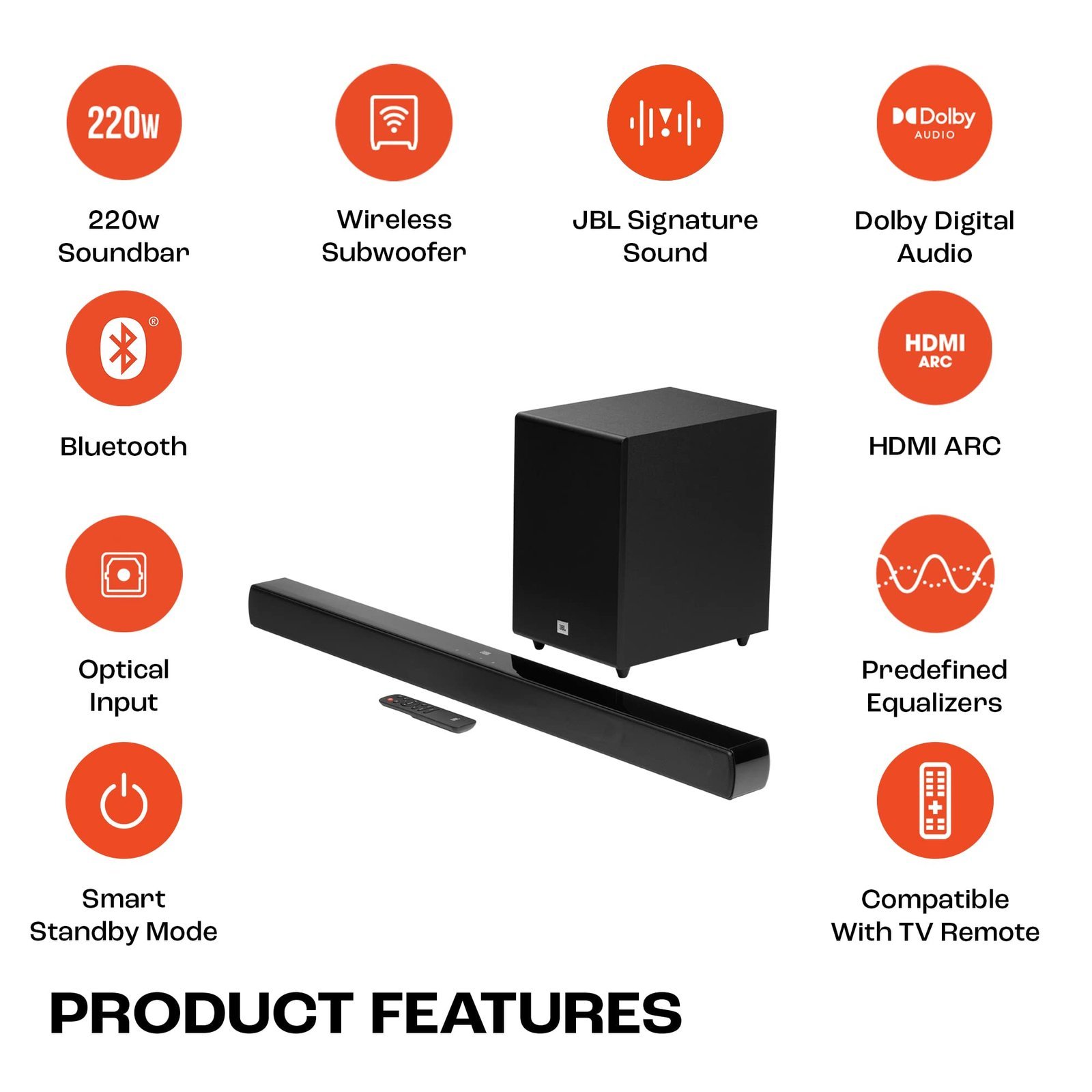 - 220W SOUNDBAR WITH WIRELESS SUBWOOFER: JBL Cinema SB271 delivers a massive 220 Watt of powerful sound from two full range drivers. The wireless subwoofer delivers deep and thumping bass and a clutter-free experience