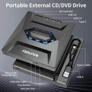 - ✅【Advanced USB 3.0 Technology】: Benefit from high-speed data transfer and stable performance with the dual-port USB 3.0 technology. This external DVD/CD drive ensures quick and reliable recording of CDs, music, videos, software installation, or creating backup discs. It’s also fully compatible with USB 2.0 and USB-C ports, eliminating the need for adapters.