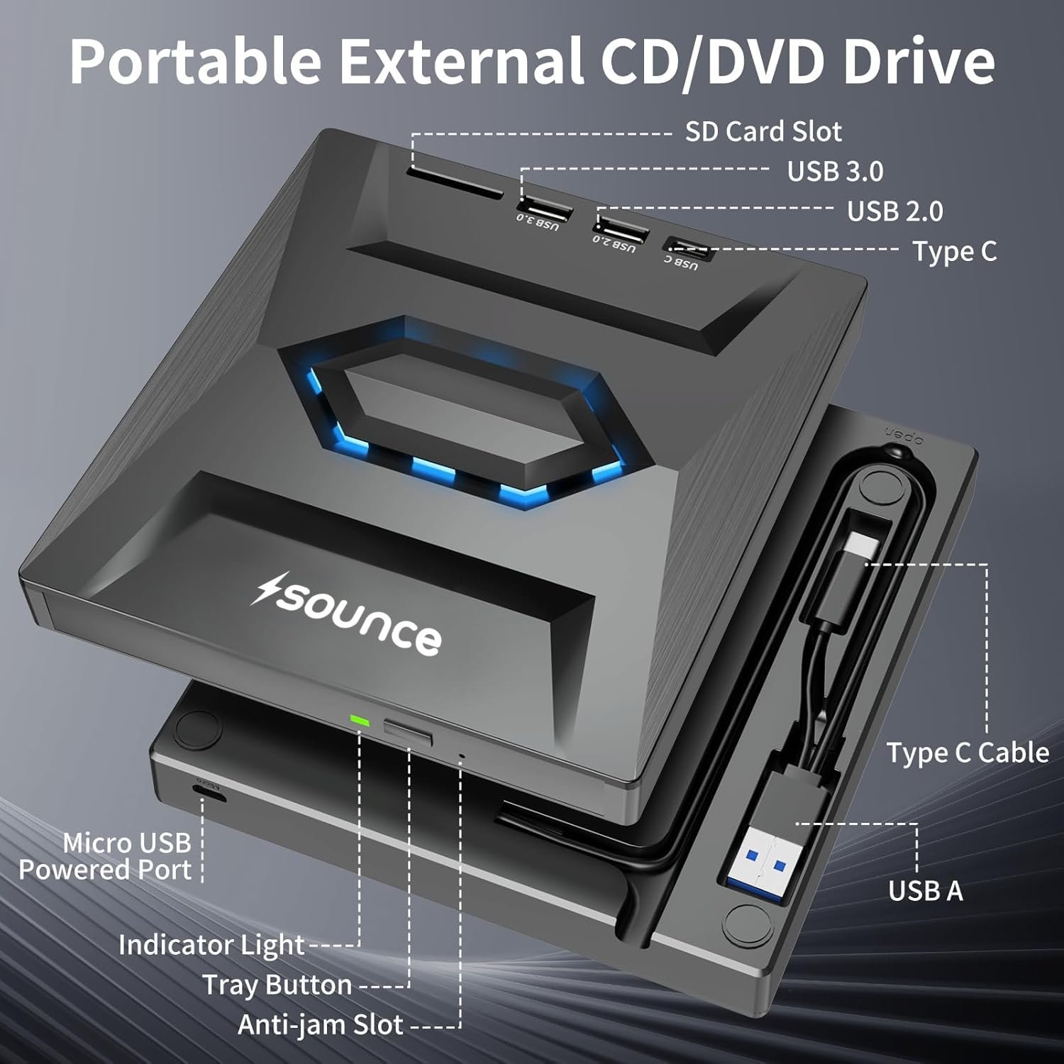 - ✅【Plug & Play Convenience】: Effortlessly use the Sounce USB 3.0 & Type C External CD DVD Writer by simply plugging it into a USB 3.0 or USB-C port. No need for additional software installation – just insert your CD or DVD, and your laptop or desktop will automatically detect the drive.