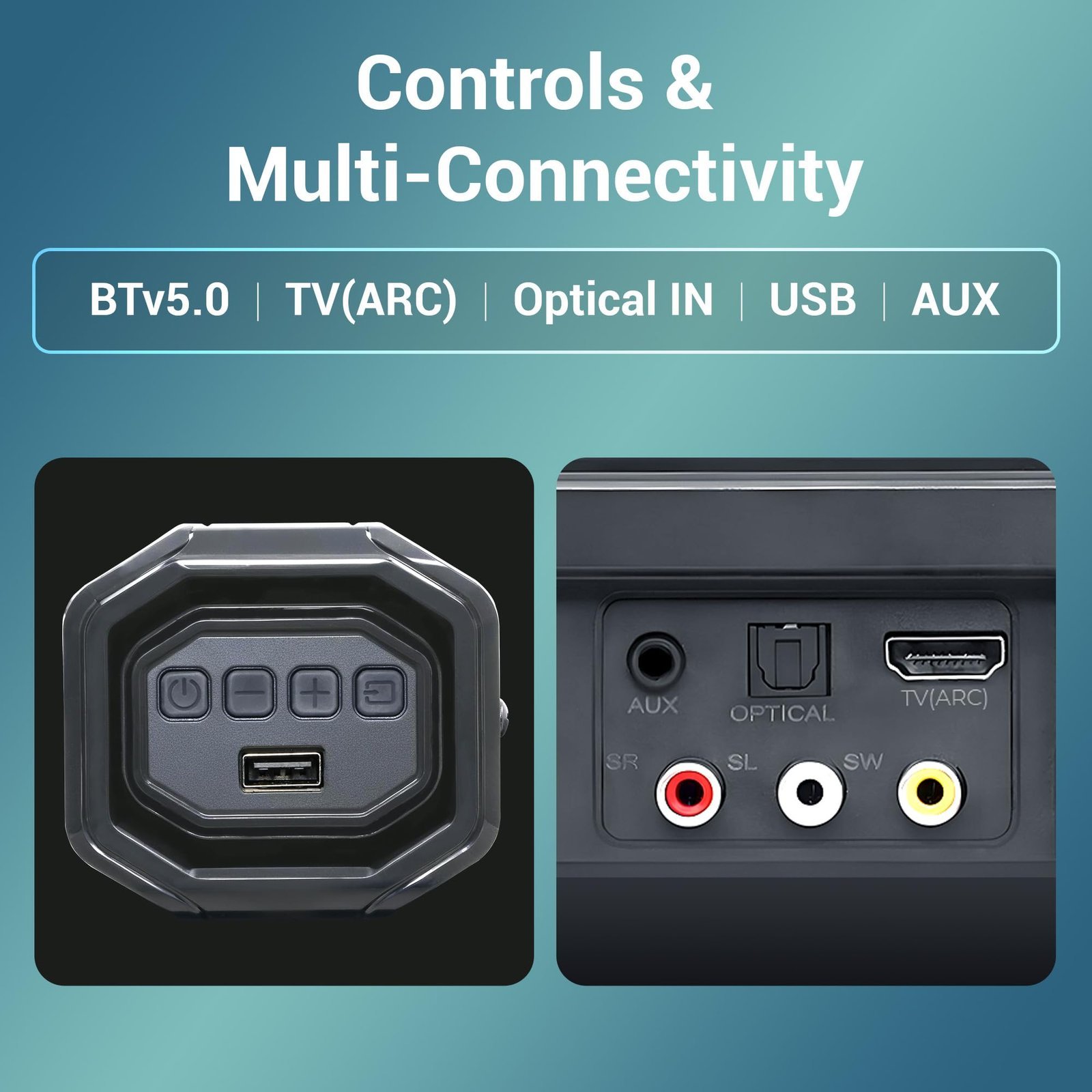 - Multi-connectivity: The soundbar comes with multi-connectivity such as BT v5.0 support, and options like TV (ARC), USB, optical, and AUX inputs.