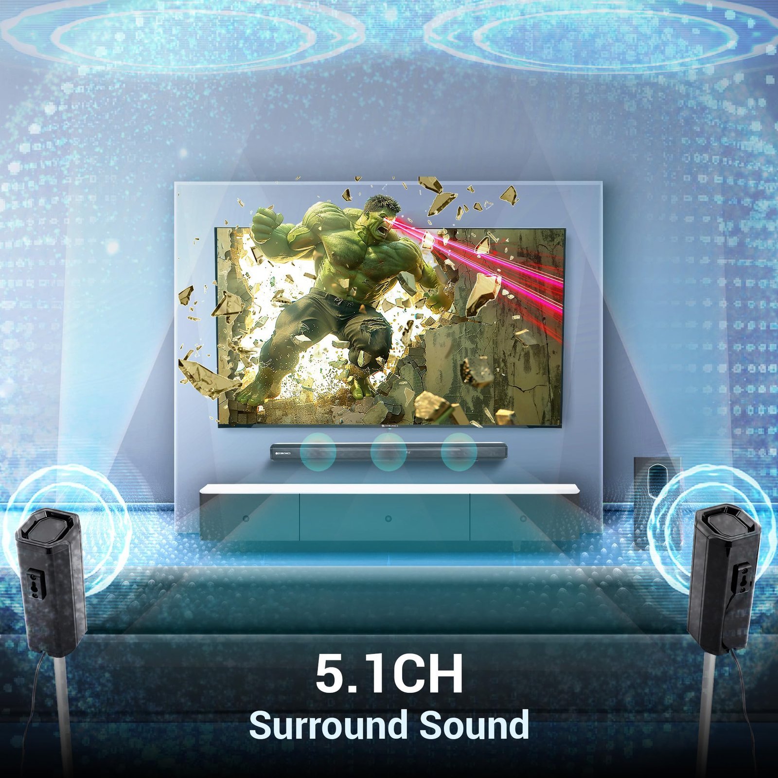 - 5.1CH Surround sound: The ZEB-Jukebar 7600 elevates your audio experience with 5.1 CH surround sound, crafting a simulated multi-channel environment for directional audio that ensures a captivating and cinematic sound experience.